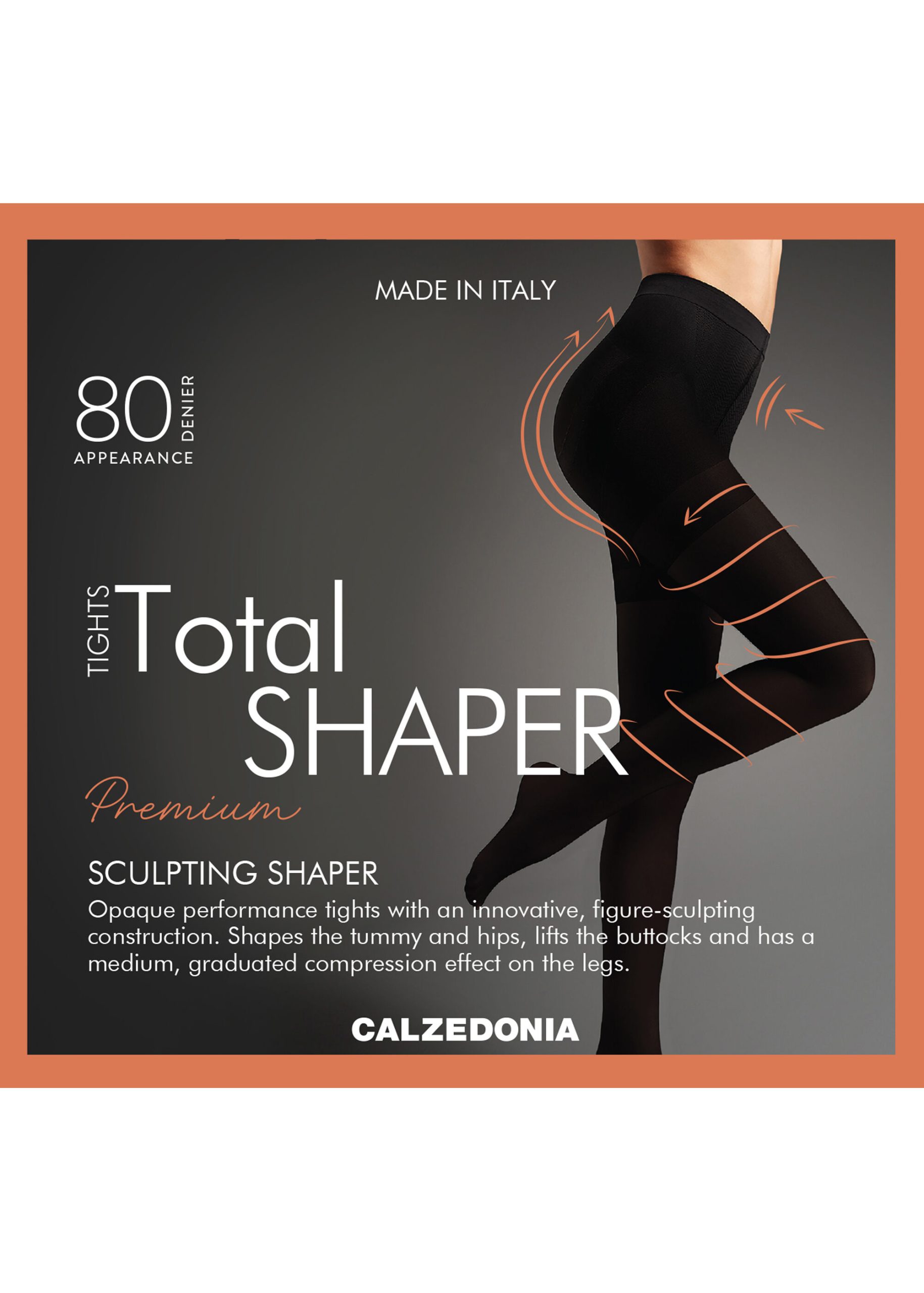 80 denier super opaque tights with lightly graduated compression. The shaping line is designed to sculpt the silhouette. Thanks to the particular characteristics of the material and the construction, the total shaper effect contours the stomach, hips and buttocks. Reinforced top and toes, flat seams, cotton gusset.