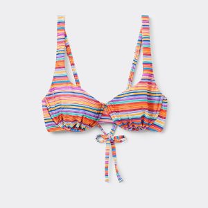 Slightly padded balconette bikini top with high center and underwire that provides excellent support and fits all sizes perfectly. Striped patterned fabric in bright colors enhanced with sparkling glitter, creating a dynamic and contemporary effect with its soft texture and vibrant look. Adjustable shoulder straps and back string tie closure. Back closure with two hook-and-eye closures to improve the fit of the underband.
