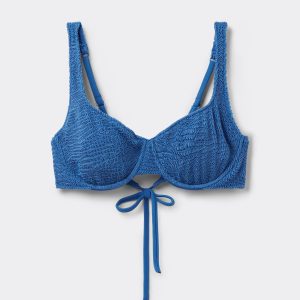 Unpadded balconette bikini top with underwire. The structure of the cups perfectly embraces and supports the bust, while the side drawstring can adjust the fit. Ideal for larger busts. The style features a crinkle fabric with a three-dimensional effect. Adjustable straps and thin tie closure on the back.