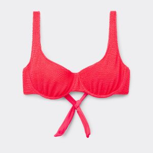 Unpadded balconette bikini top with underwire. The structure of the cups perfectly embraces and supports the bust, while the side drawstring can adjust the fit. Ideal for larger busts. The style features a crinkle fabric with a three-dimensional effect. Adjustable straps and thin tie closure on the back.