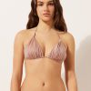 Unpadded balconette bikini top with underwire. The structure of the cups perfectly embrace and support the bust, thanks to the side drawstring on the cups that can also adjust the fit. Ideal for the larger bust. The style features a bright fabric with a silky effect, embellished by ruffles and gold tips. Adjustable straps and hook closure with two adjusters.