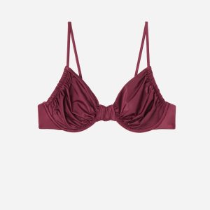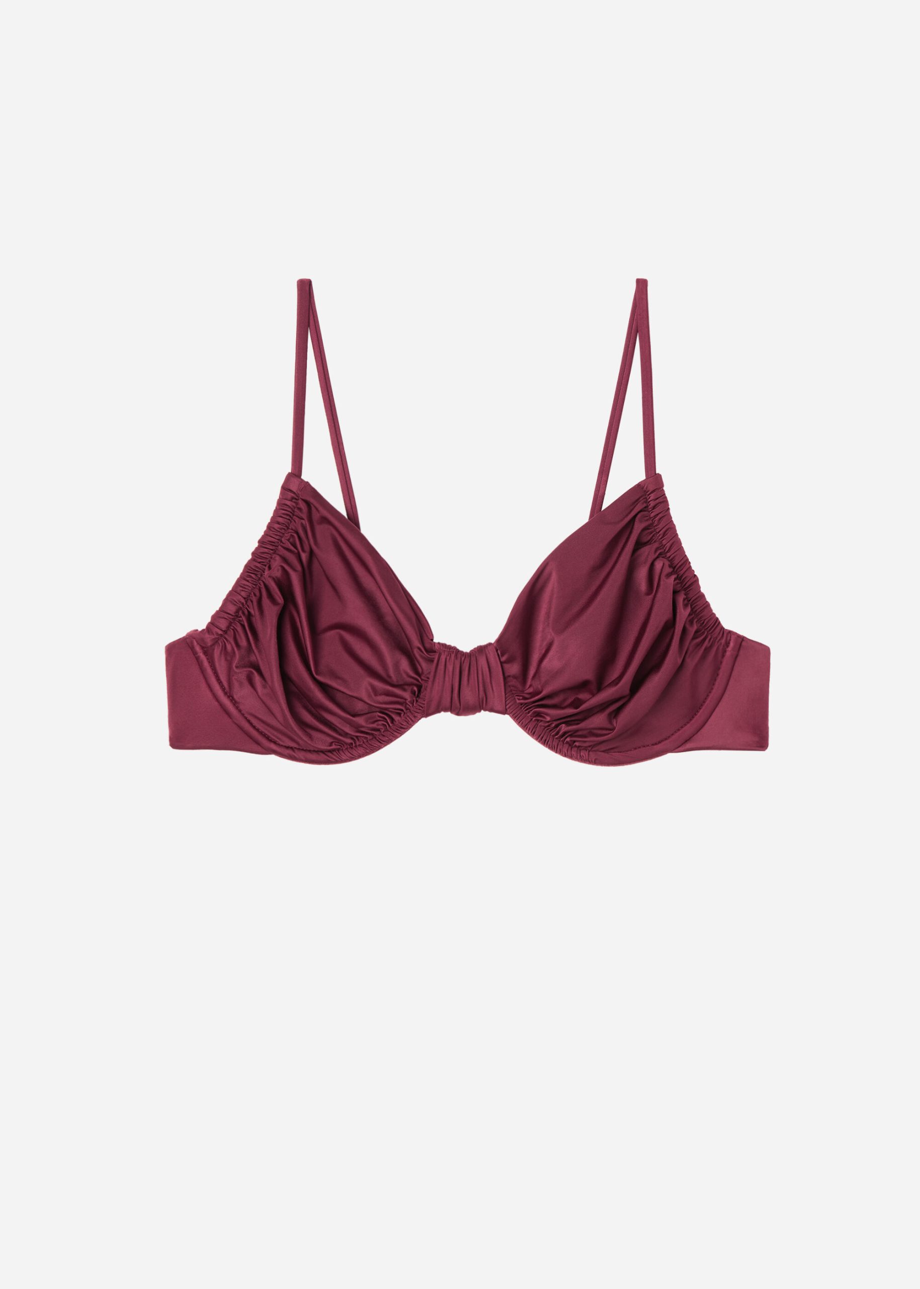 Unpadded balconette bikini top with underwire. The structure of the cups perfectly embrace and support the bust, thanks to the side drawstring on the cups that can also adjust the fit. Ideal for the larger bust. The style features a bright fabric with a silky effect, embellished by ruffles and gold tips. Adjustable straps and hook closure with two adjusters.