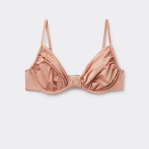 Unpadded balconette bikini top with underwire. The structure of the cups perfectly embrace and support the bust, thanks to the side drawstring on the cups that can also adjust the fit. Ideal for the larger bust. The style features a bright fabric with a silky effect, embellished by ruffles and gold tips. Adjustable straps and hook closure with two adjusters.