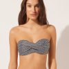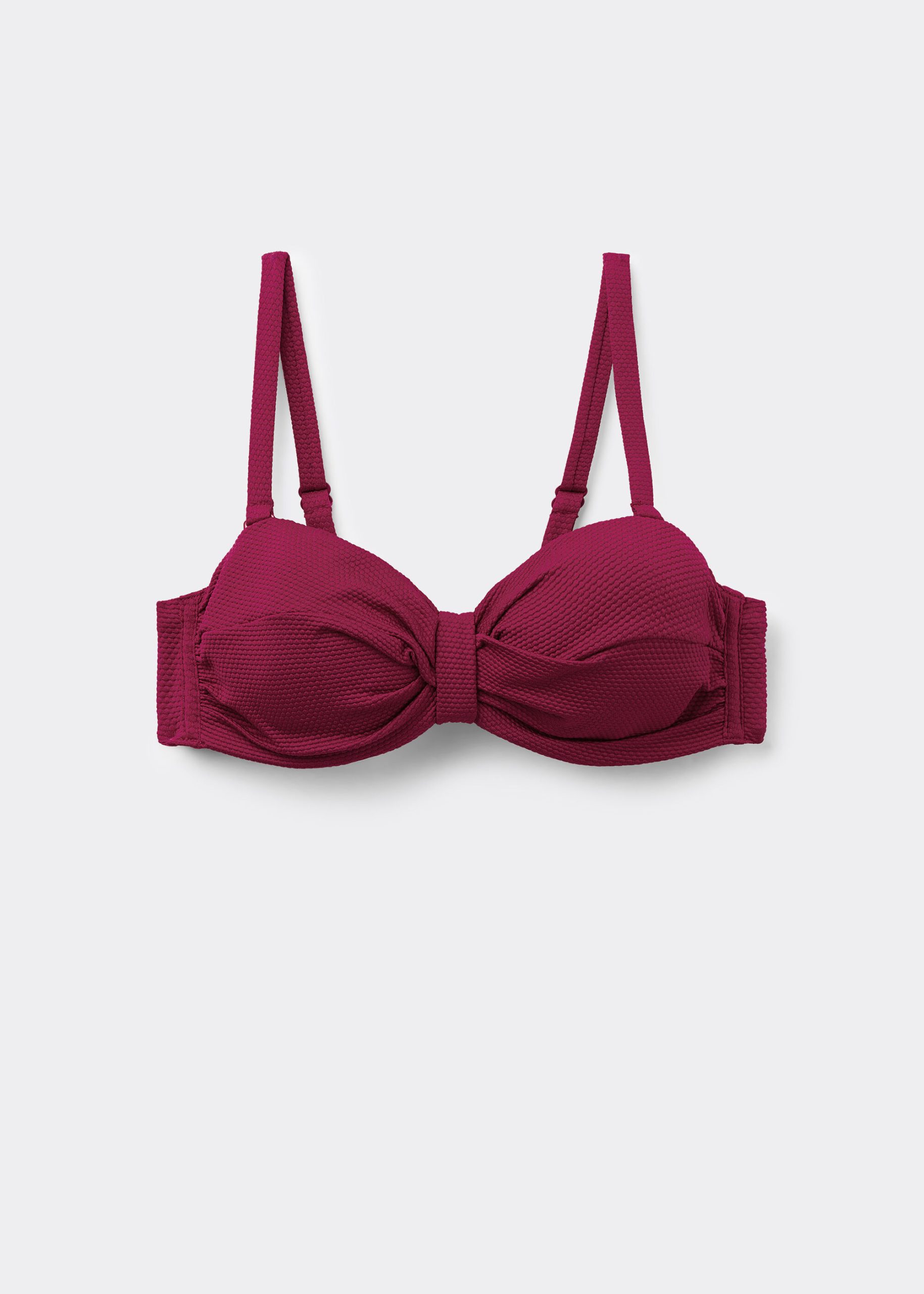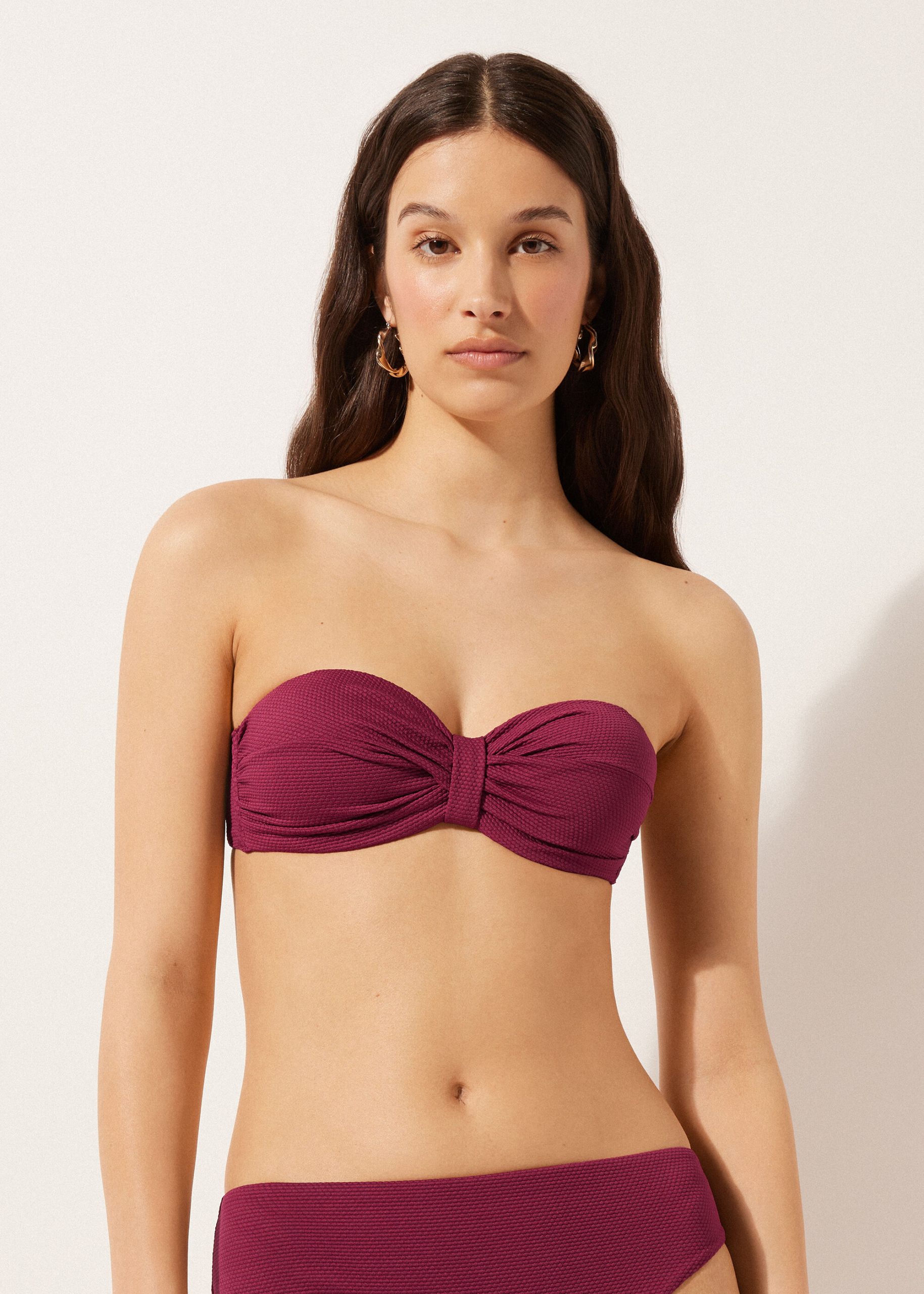 Lightly padded bandeau bikini top with underwire and side boning for excellent support, ideal also for those with larger busts. The removable string tie in the center allows the neckline to be adjusted to get a personalized fit. Made from an elegant piqué fabric, it features adjustable and removable shoulder straps for ultimate comfort and versatility. Back hook closure with two adjusters for a perfect fit.