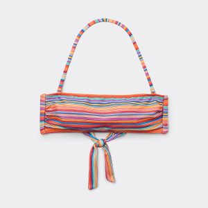 Lightly padded straight-cut bandeau bikini top, wireless for a natural effect. The side boning helps support the bust. Striped patterned fabric in bright colors enhanced with sparkling glitter, creating a dynamic and contemporary effect with its soft texture and vibrant look. Removable shoulder strap. Back tie closure.