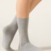 Women’s short socks in soft cotton. The micro-ribbing offers a refined touch and right amount of stretch. The romantic edge and contrasting color bands add a subtle and feminine originality.