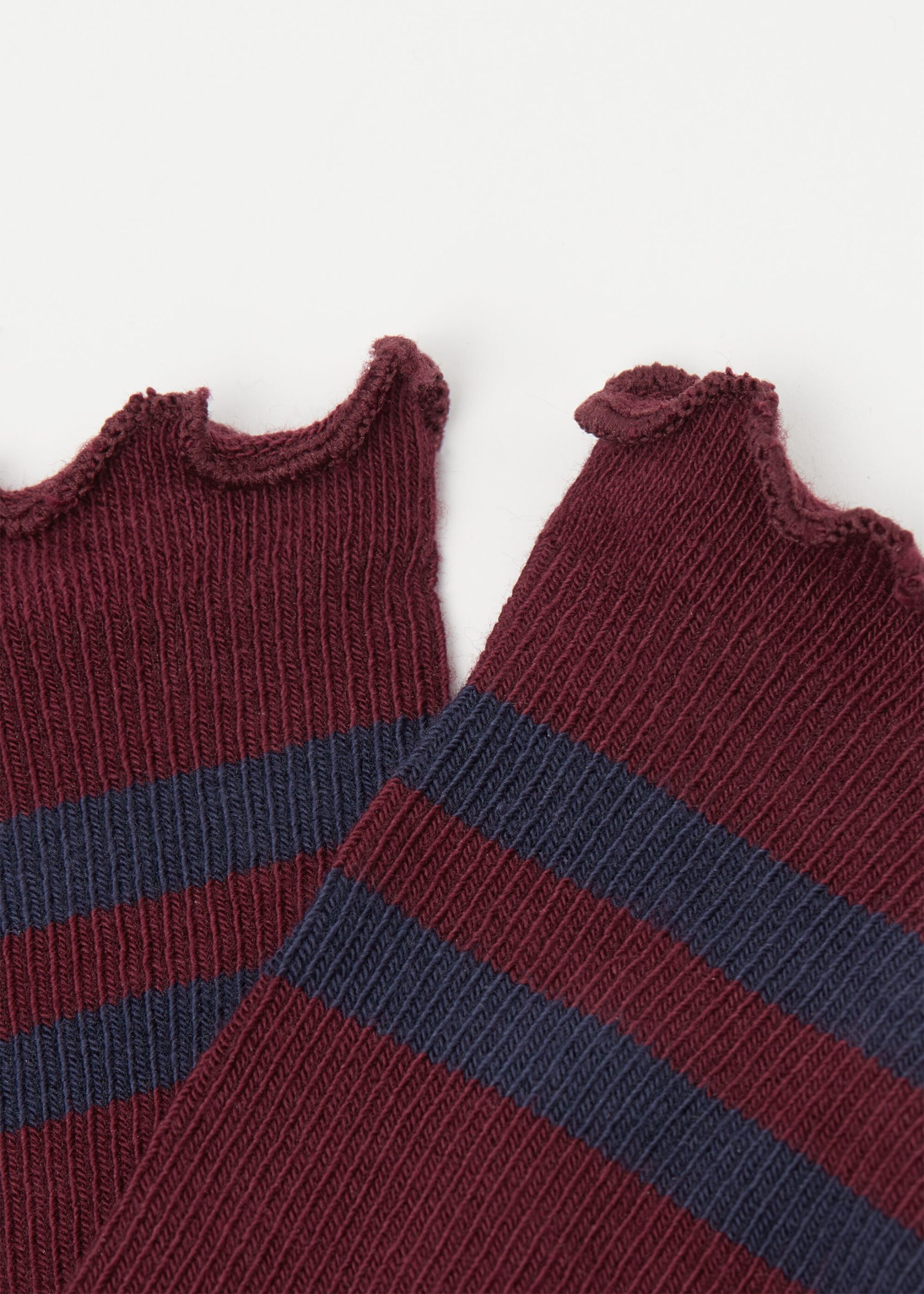 Women’s short socks in soft cotton. The micro-ribbing offers a refined touch and right amount of stretch. The romantic edge and contrasting color bands add a subtle and feminine originality.