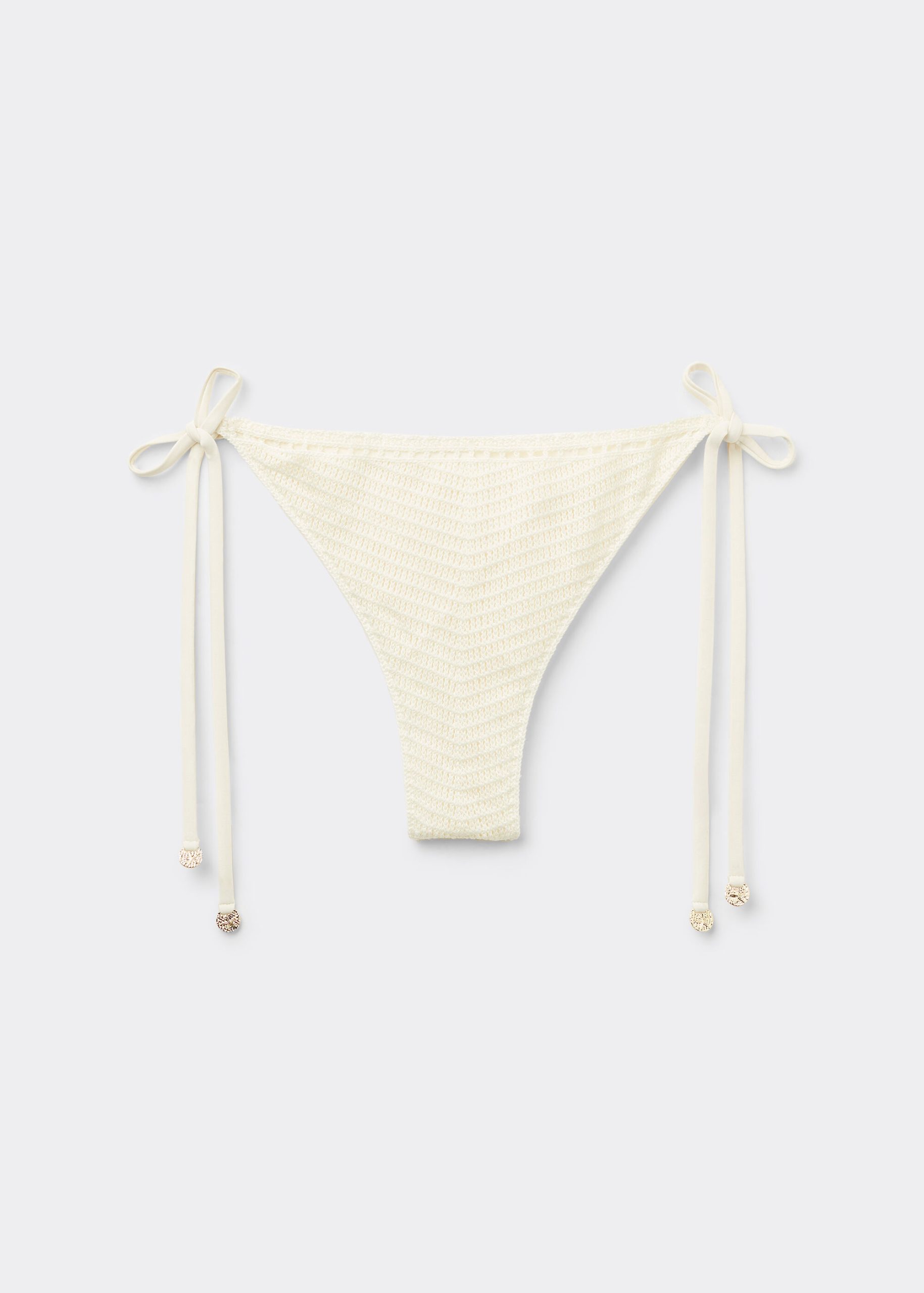 Brazilian cut bikini bottoms with side ties made from refined and sophisticated crochet fabric. The slightly rounded waist at the front allows for both a classic or more high-cut fit, depending on one’s physique. Fully lined with invisible seams.