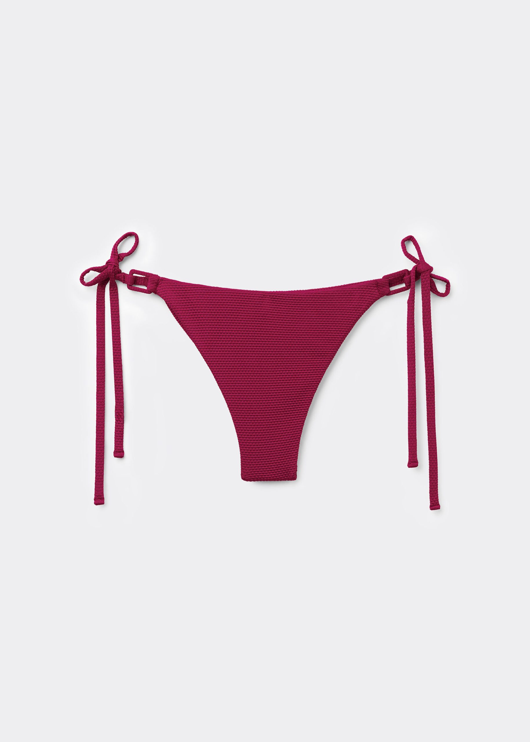 Brazilian cut bikini bottoms with side ties. The refined and hard-wearing piqué fabric is recognizable by its unique texture. The slightly rounded waist at the front allows for both a classic or more high-cut fit, depending on one’s physique. Fully lined with invisible seams.