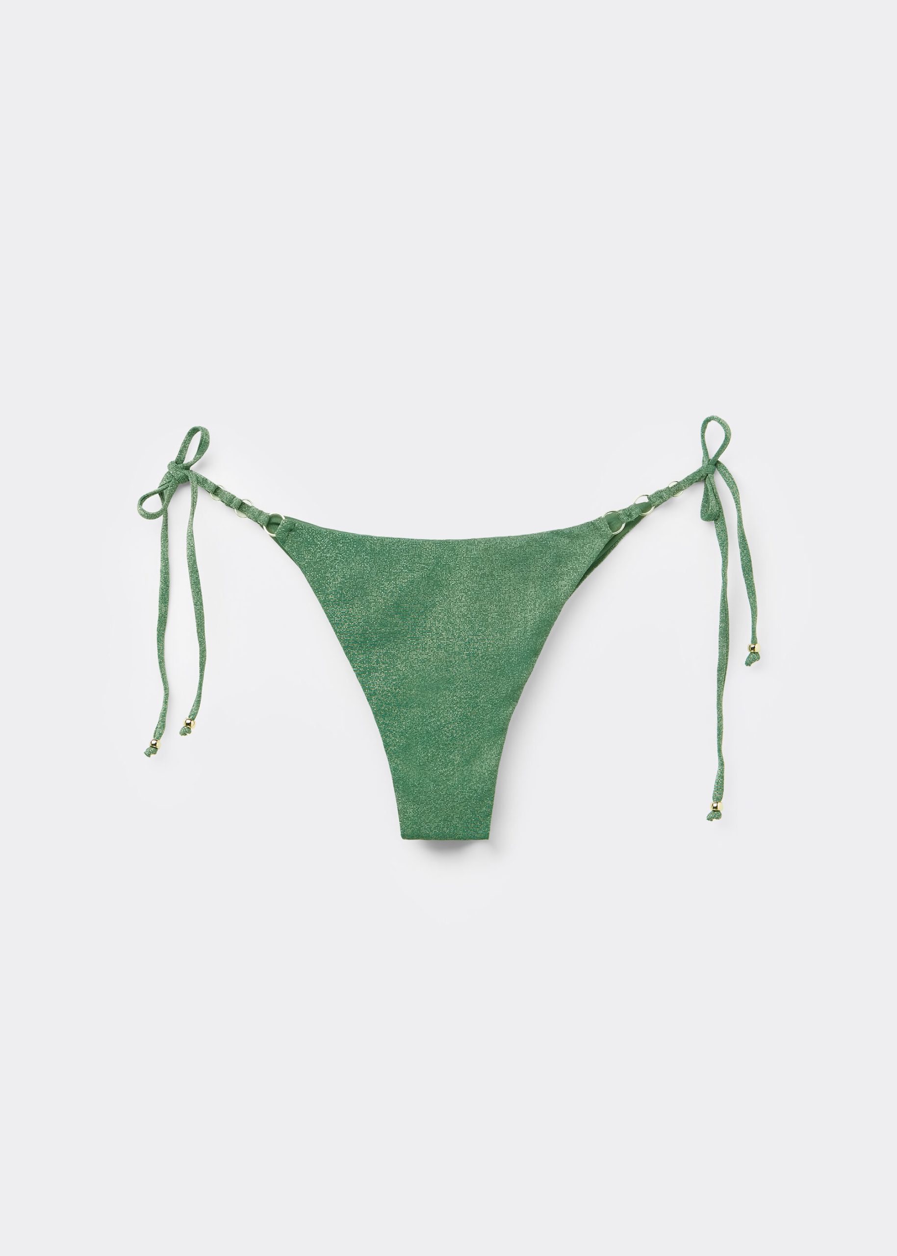 Brazilian cut bikini bottom with side ties to adjust the fit. Soft fabric with shiny lamé thread embellished with nickel free small gold rings. Fully lined. Back gathered seam for a better fit.