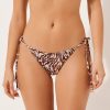 Brazilian cut bikini bottom with side ties to adjust the fit. The style features a bright fabric with a silky effect, embellished by ruffles and gold tips. Fully lined with invisible seams.