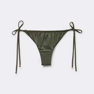 Brazilian cut bikini bottom with side ties to adjust the fit. The style features a bright fabric with a silky effect, embellished by ruffles and gold tips. Fully lined with invisible seams.