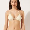 Brazilian cut bikini bottom with side ties to adjust the fit. The style features a bright fabric with a silky effect, embellished by ruffles and gold tips. Fully lined with invisible seams.