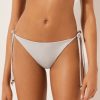 Brazilian cut bikini bottoms with side ties to adjust the fit. The bright glittery fabric stands out with its sophisticated shine, perfect for a glamorous look. Fully lined. Back gathered seam for a better fit.