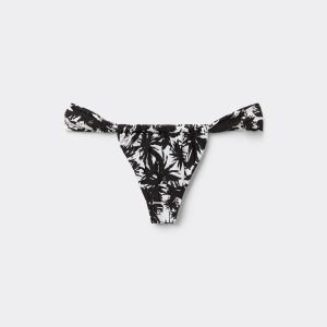 Brazilian bikini bottoms with invisible seams. The slightly rounded waist at the front allows for both a regular and more high-cut fit, depending on one’s physique. The style features a black and white palm tree patterned fabric.