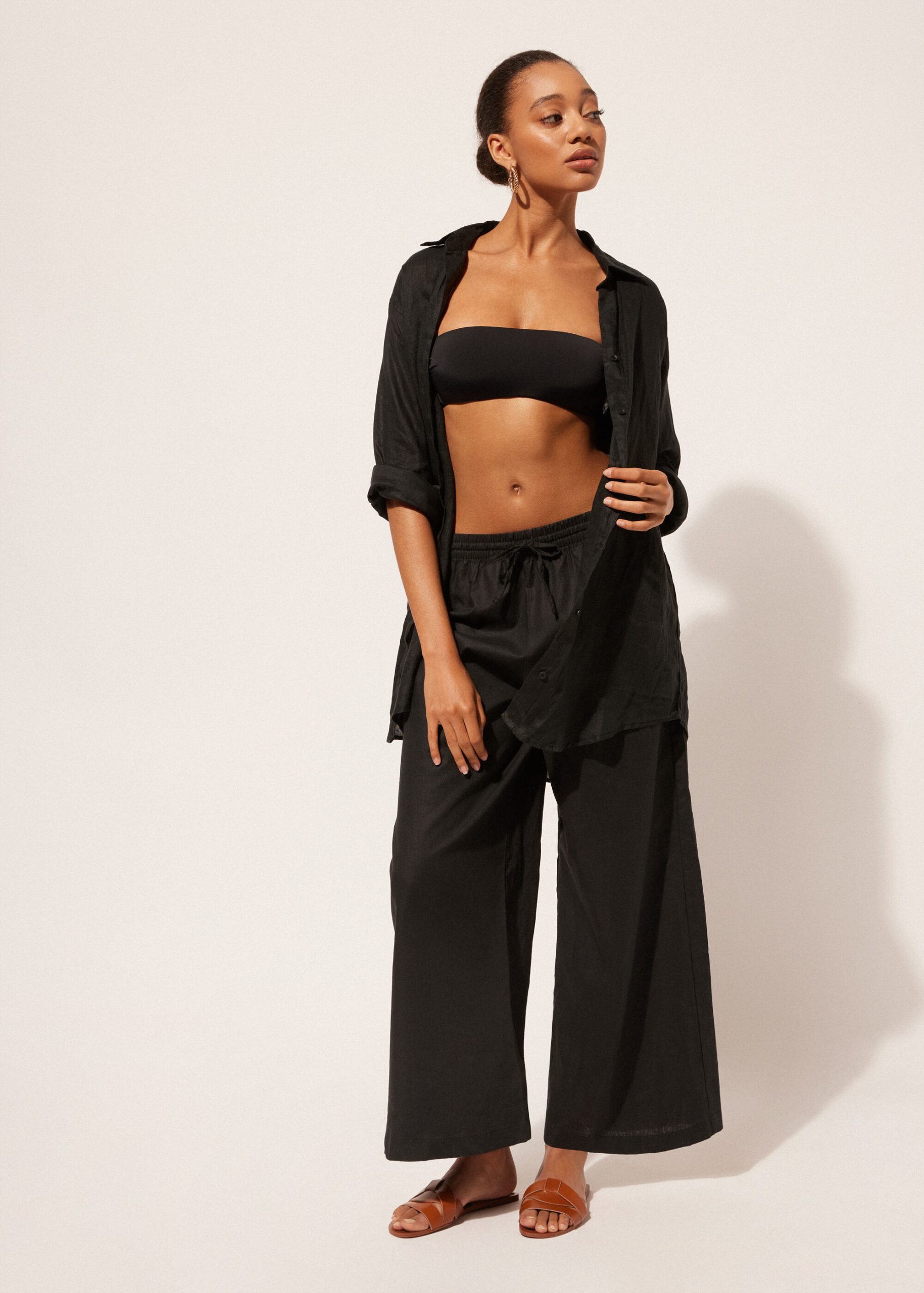 Cotton and linen pants with comfortable drawstring at the waistband. Palazzo style. Available in different colors that match the beachwear collection.
