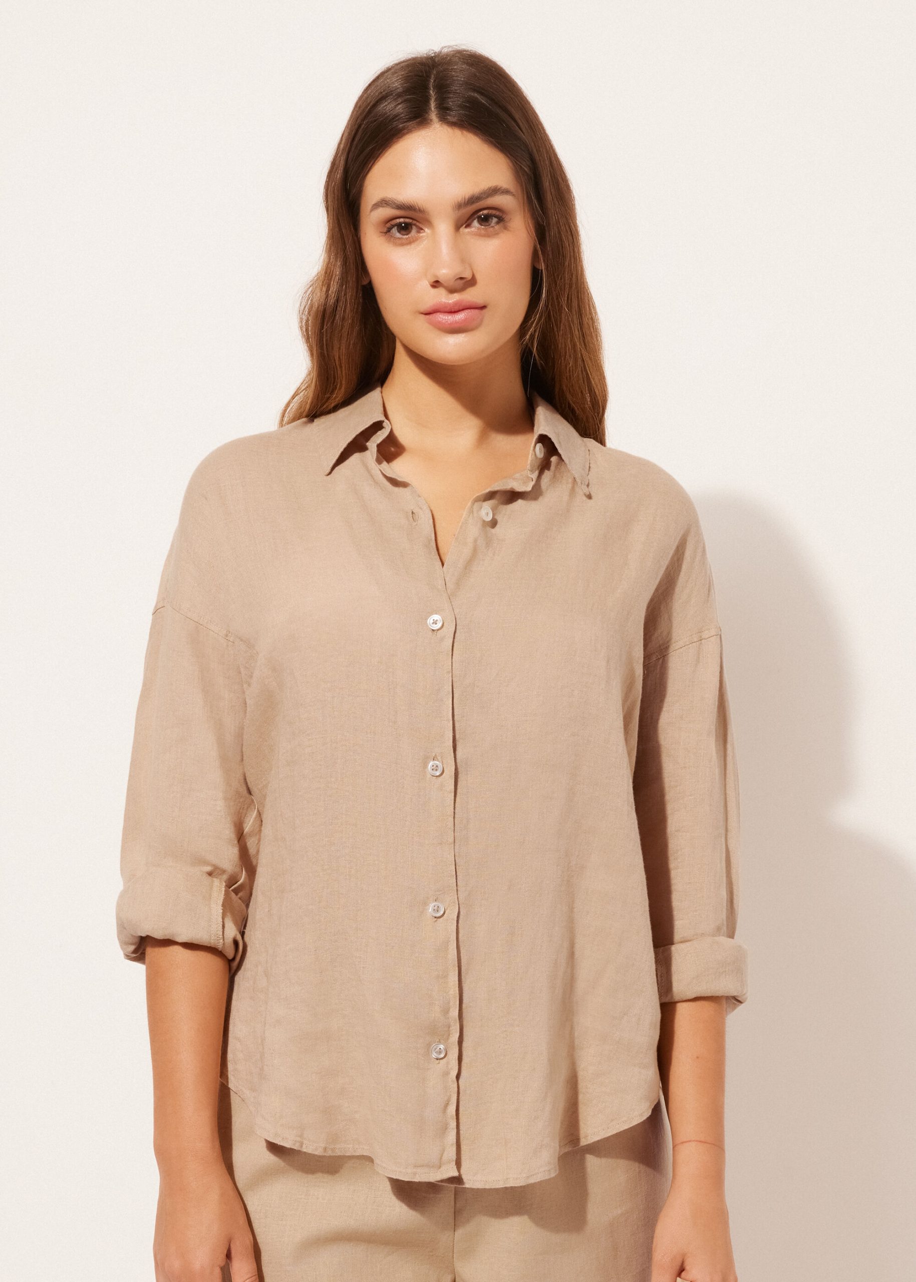Cropped button-down shirt in linen, perfect for those who love natural fibers, with shirt collar and long sleeves.