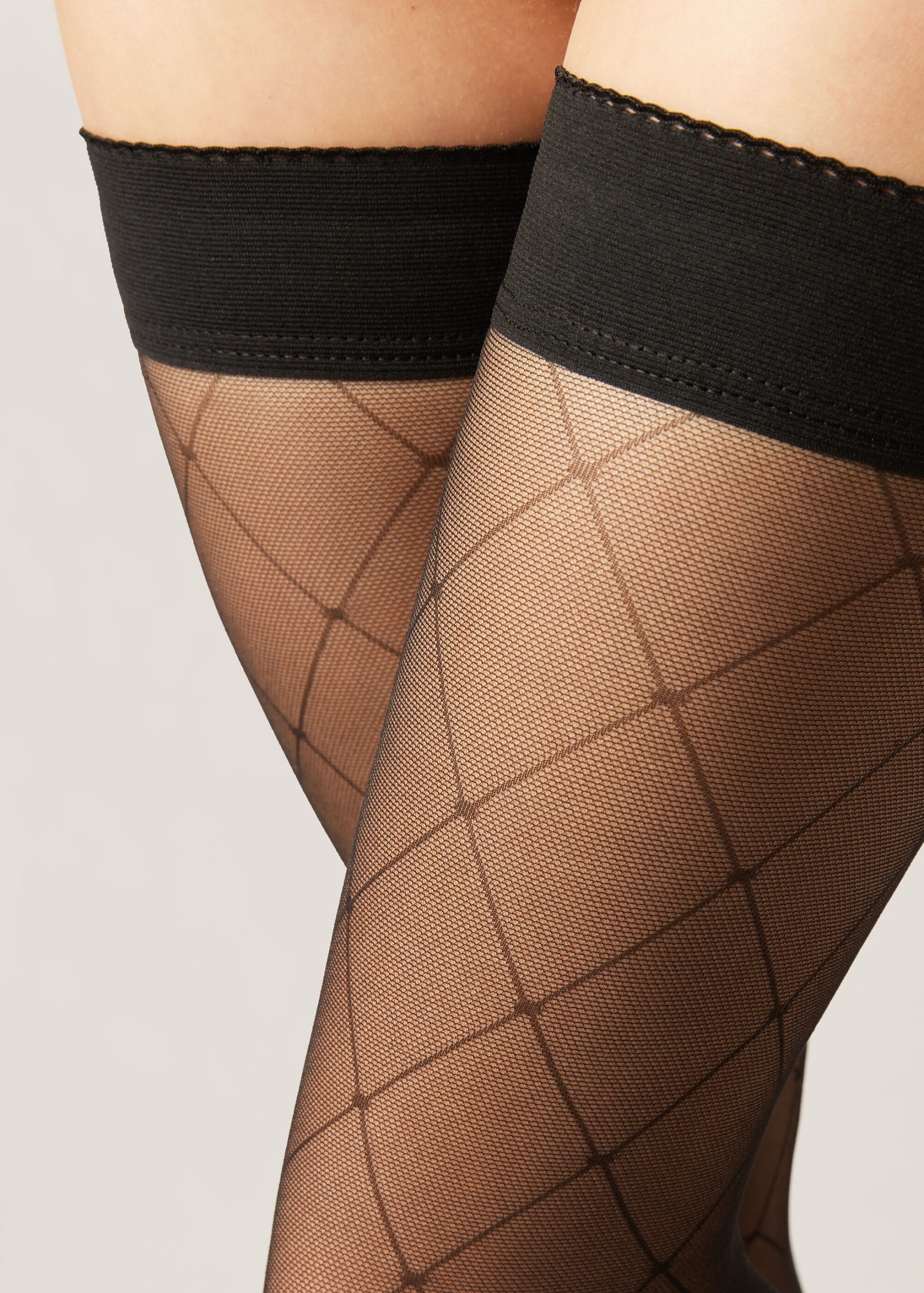 Fifty denier mesh thigh-high stockings with an elongated diamond pattern, finished with a silicone ruffle. A balanced mix of graphic design and femininity.