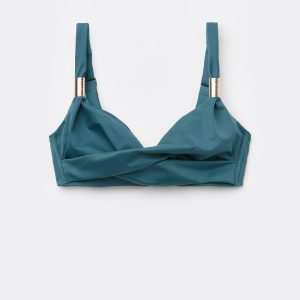 Triangle style bikini top, wireless and unpadded for a natural effect. The structure of the cups and the wide fit at the sides provide good support for larger busts. The compact fabric, designed to exalt and enhance the body’s curves, ensures excellent support and is studied to make every woman feel at ease without constraint. The center gore features draping in the middle and golden accessories that exalt its elegance. Adjustable shoulder straps. Back closure with two hook-and-eye closures to improve the fit of the underband.