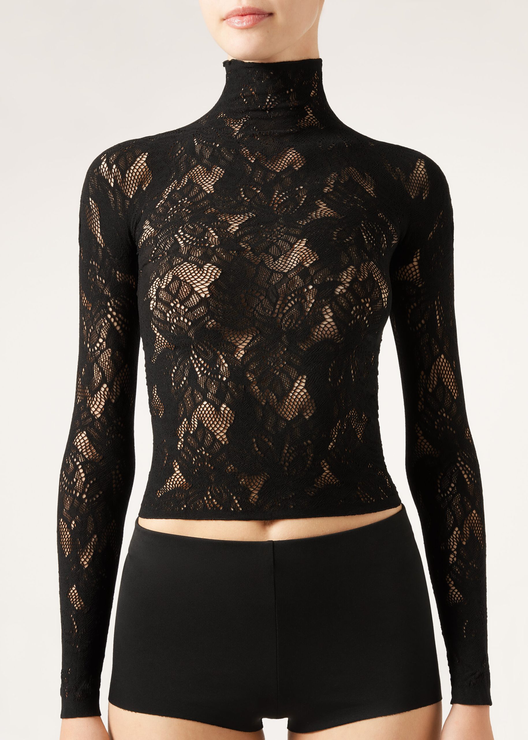 Floral motif mesh top, perfect to pair with coordinating tights MODC2185. With a funnel neckline and long sleeves, it is the ideal ally for an elegant and sophisticated look, even under a jacket.