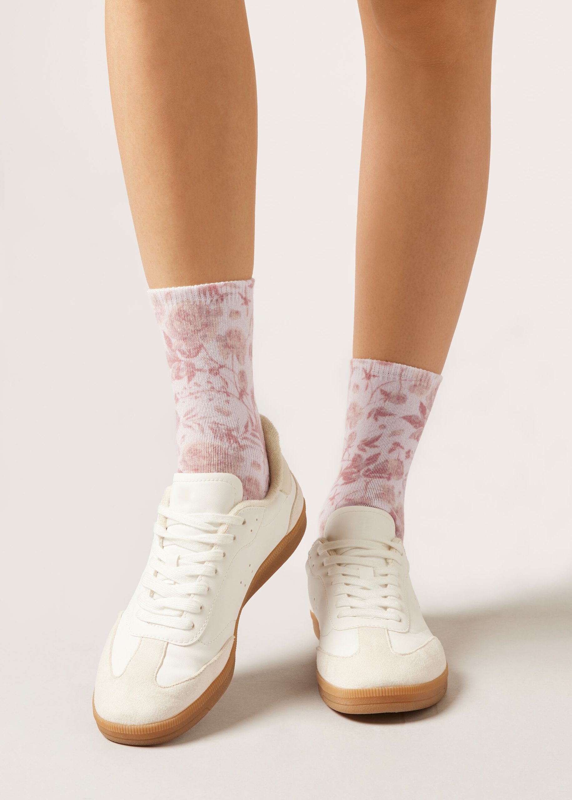 Women’s short socks with a floral digital print in delicate colors for a fresh and feminine look, perfect for a refined and original aesthetic.