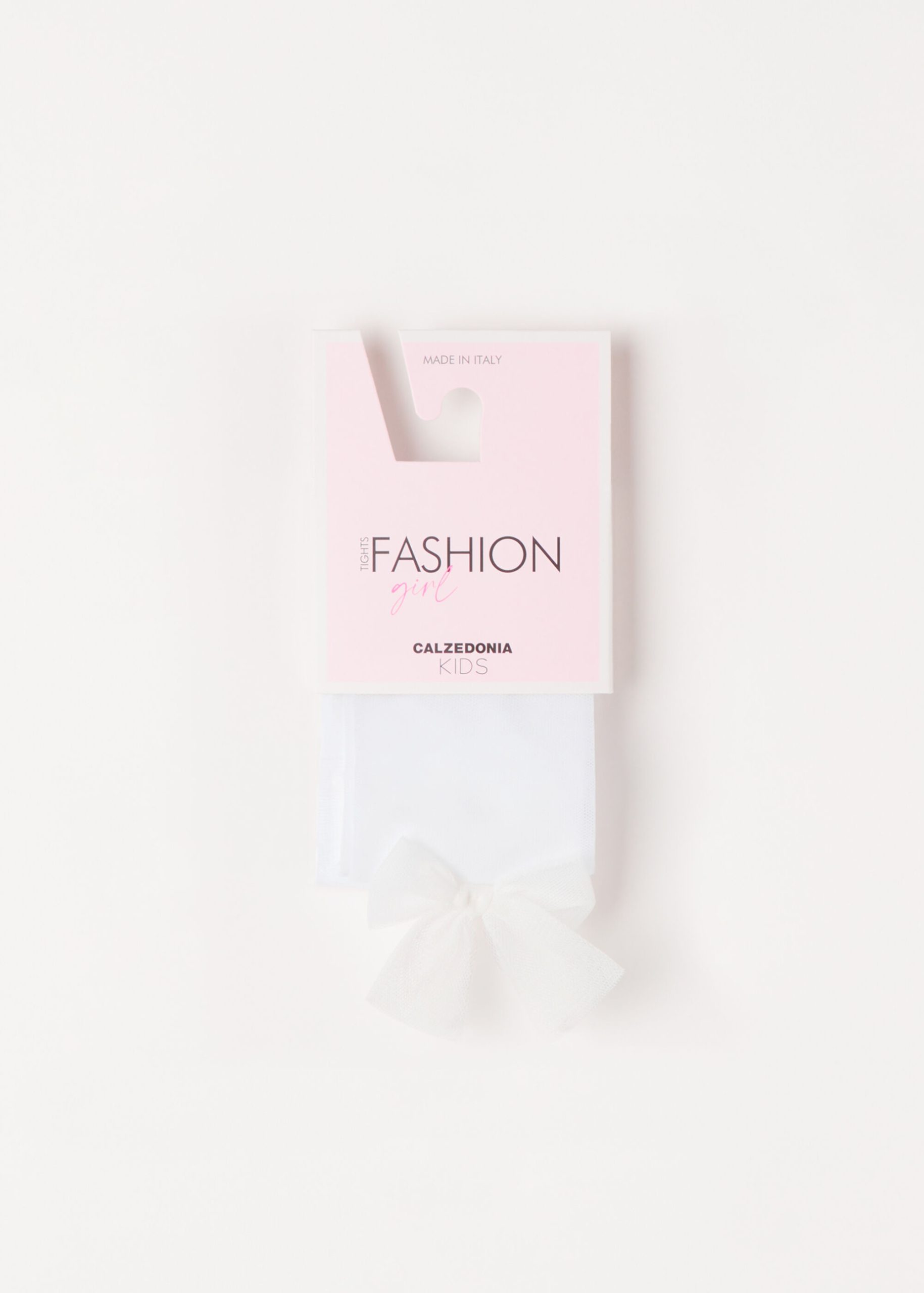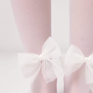 Girls’ 30 denier tulle tights featuring an elegant bow appliqué.