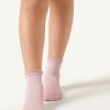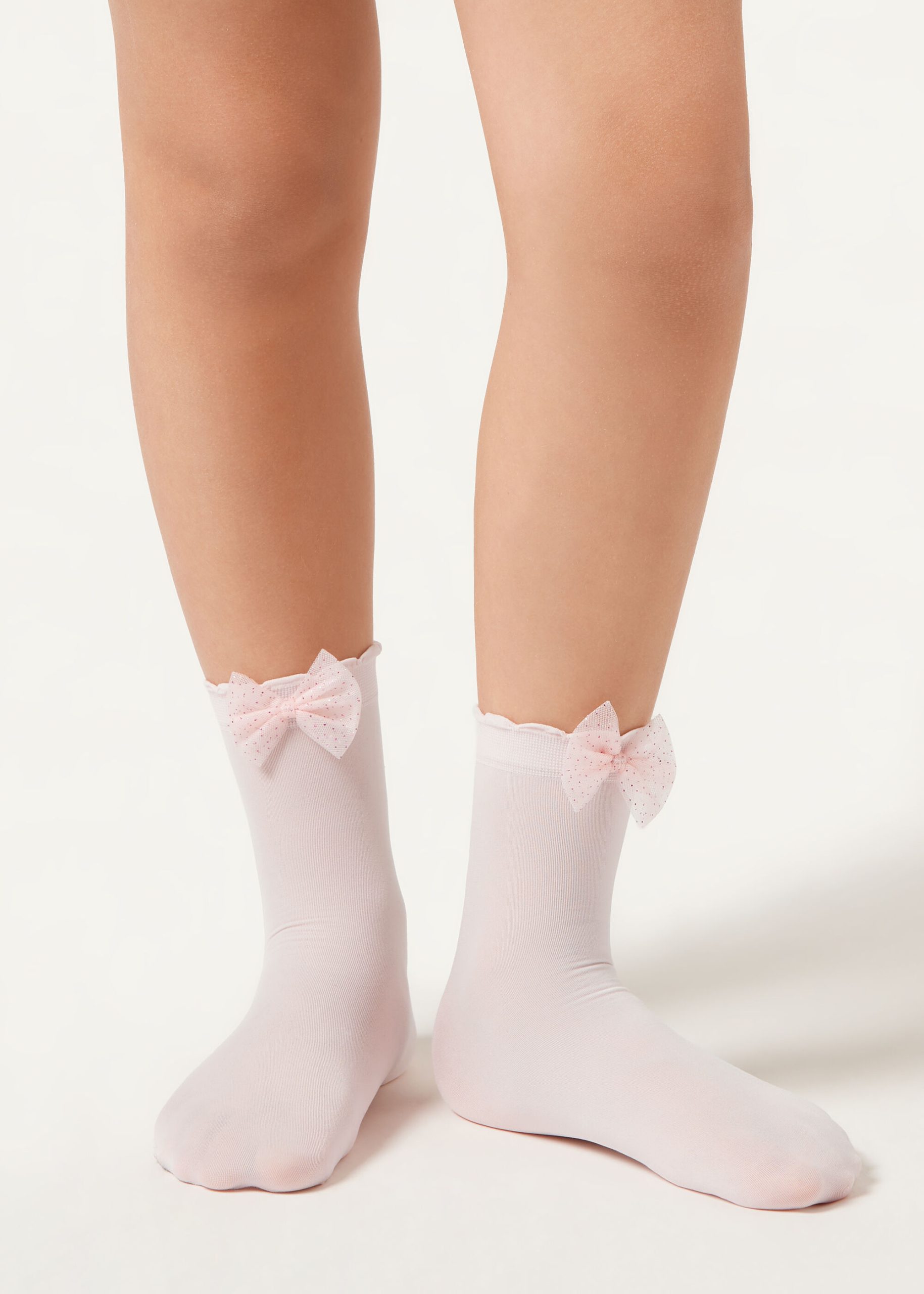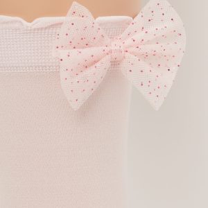Girls’ 30 denier microfiber short socks with elegant tulle bow with glitter appliqué, trimmed with a scalloped edge.