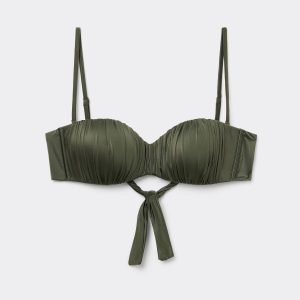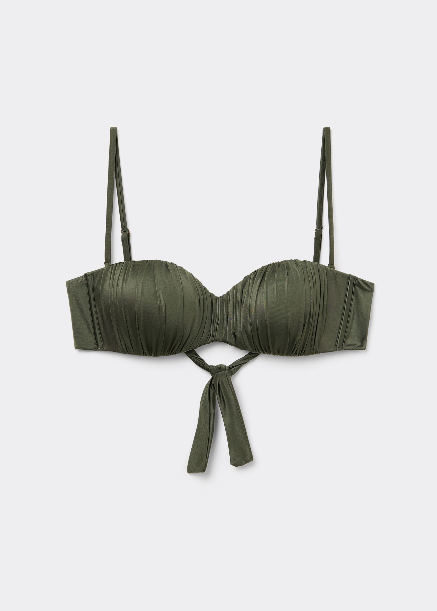 Bandeau bikini top with underwire, graduated padding cups, and side boning to guarantee good support, perfect for those with larger busts. The style features a bright fabric with a silky effect with ruffles. Adjustable and removable straps. Back tie closure.