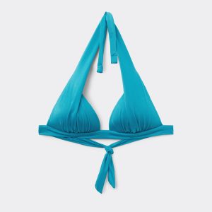 Wireless fixed triangle bikini top with graduated padded cups that add volume to enhance the décolleté. The style features a bright fabric with a silky effect, embellished by ruffles. The shoulder straps have eyelets on the ends so they can be hooked onto the back band or tied behind the neck. Back tie closure.
