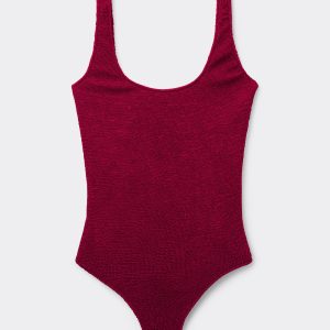 Round neck one piece swimsuit, wireless and unpadded for a natural effect. The style features a crinkle fabric with a three-dimensional effect. Brazilian style coverage in back and ‘80s style high cut legs. Fully lined.
