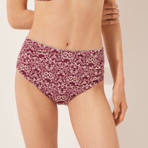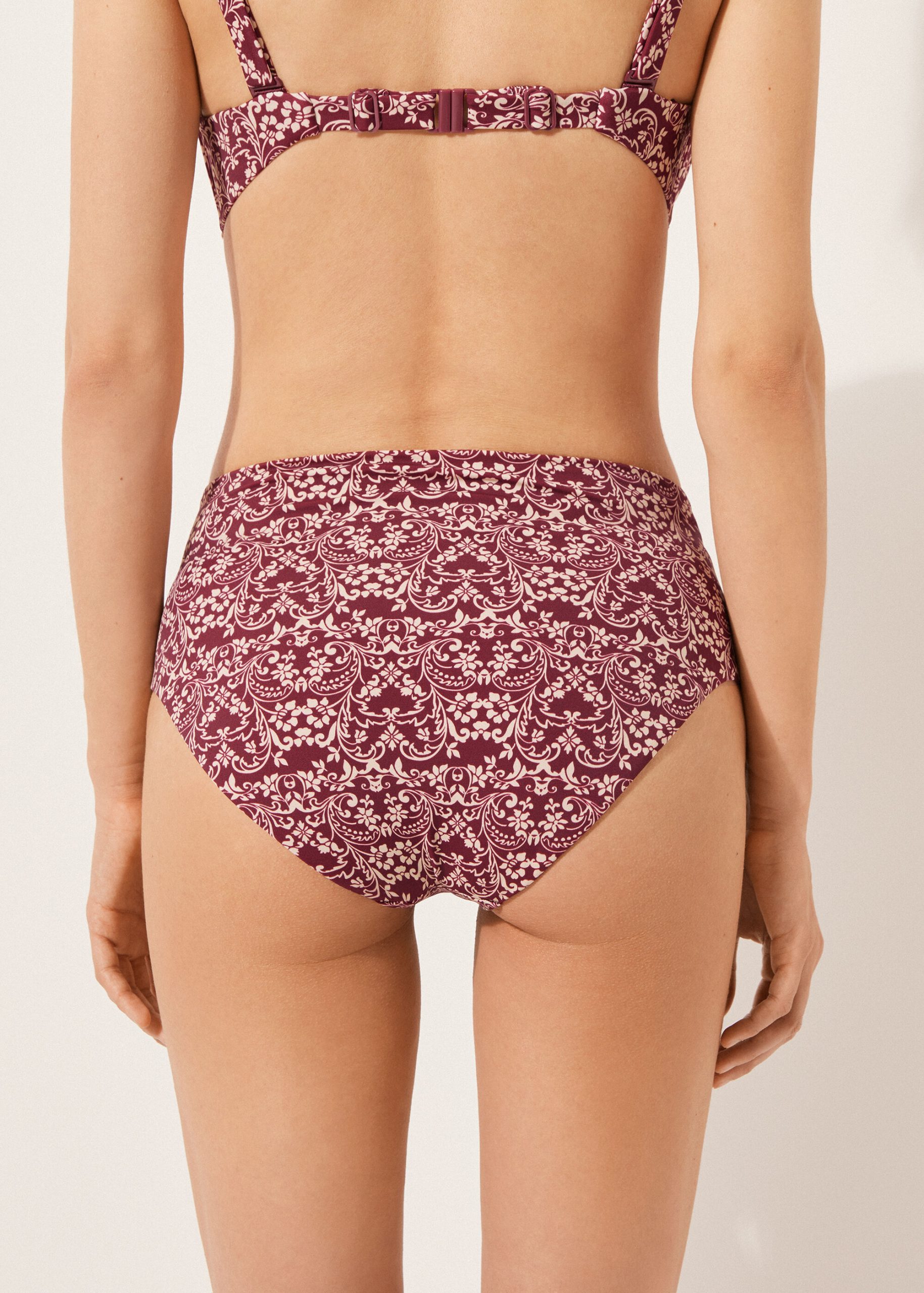 Bikini bottoms with a high waist with a shaping effect on the abdomen, guaranteed by a special tulle at the front. An elegant floral pattern with shades of burgundy that creates a refined and natural look. Fully lined with invisible seams.