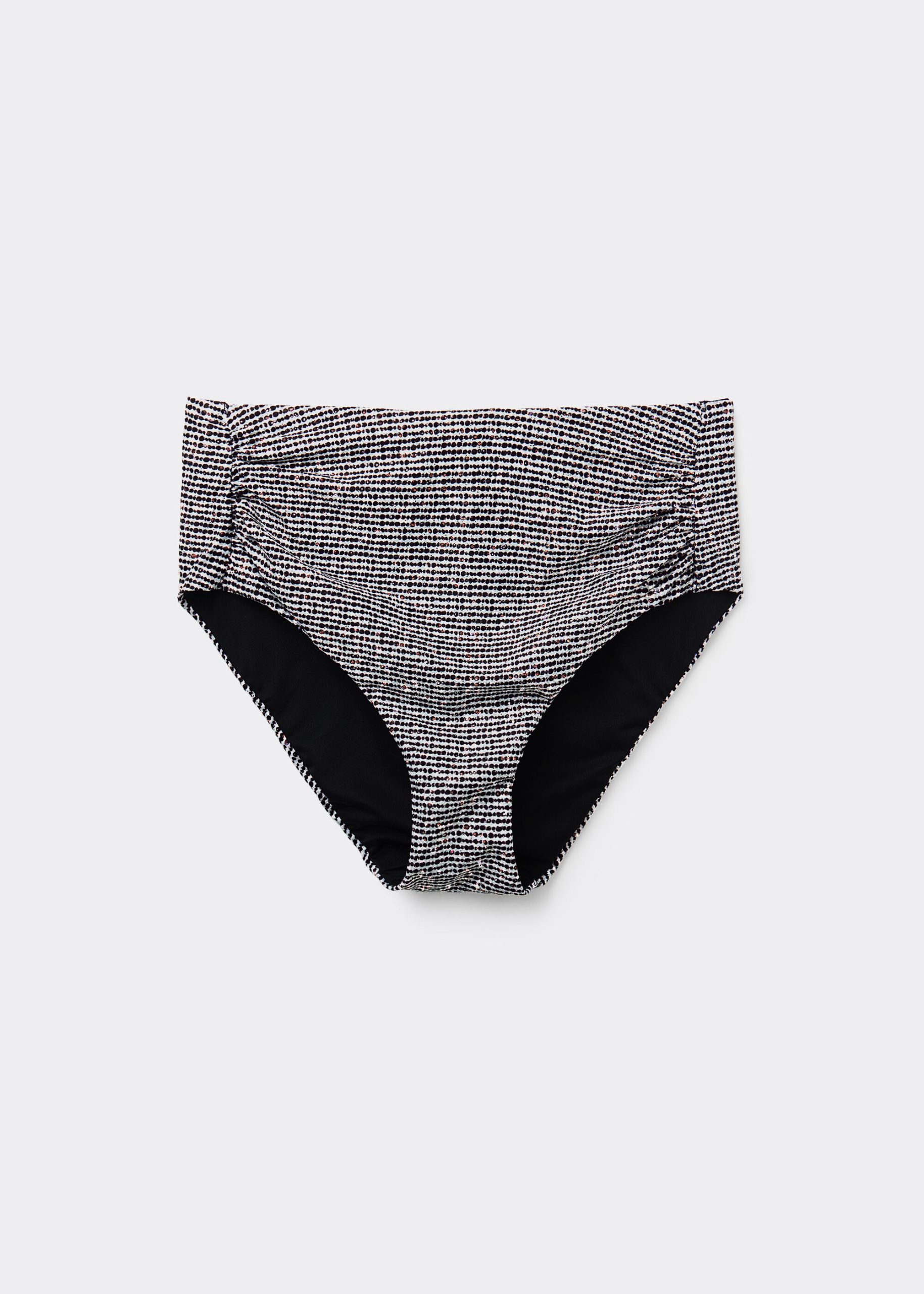 Bikini bottom with a high waist with a shaping effect on the abdomen, guaranteed by a special tulle at the front. The style features a black and white toned pattern embellished with a coated effect. Fully lined with invisible seams.