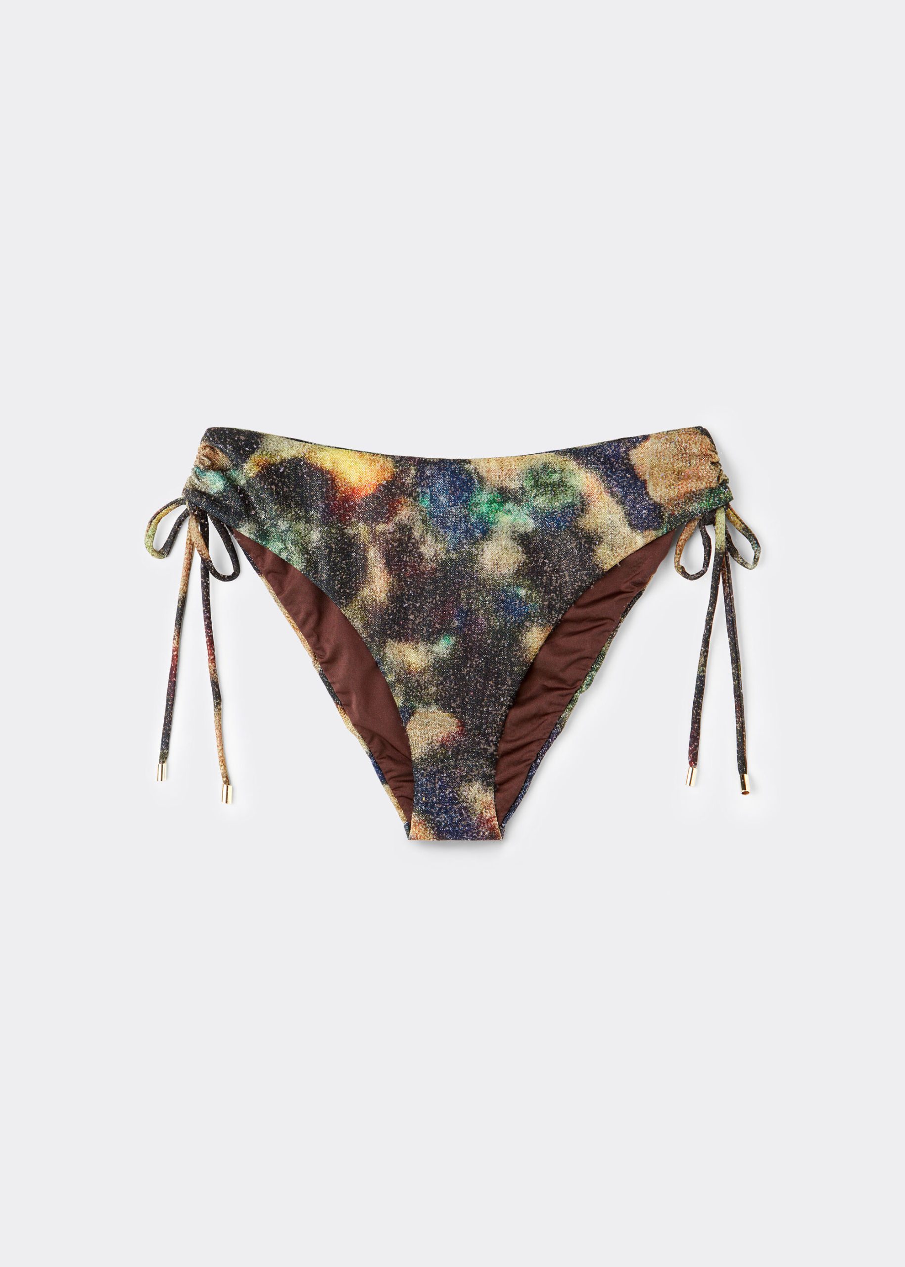 High-waist bikini bottoms with side drawstrings to adjust the fit of the leg openings, embellished with golden tips. The style features a lamé fabric with a camouflage print. Fully lined with invisible seams.