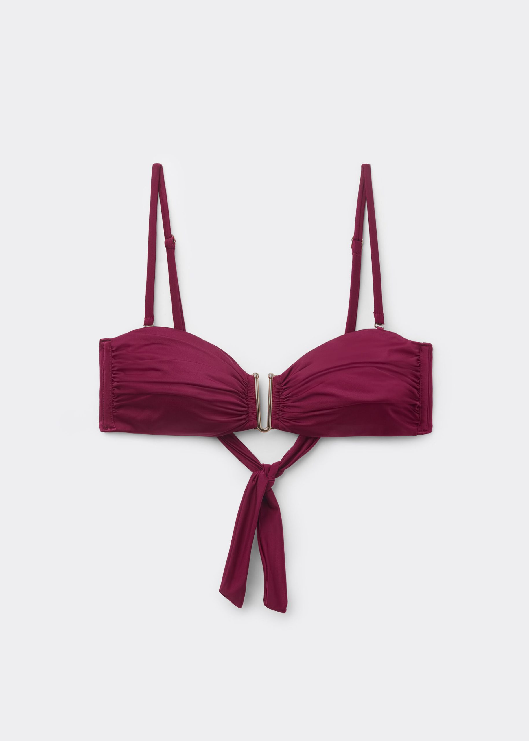 Bandeau bikini top with lightly padded cups. The side boning guarantees good support. The style features shiny fabric with a golden accessory at the center of the bust. Adjustable and removable straps. Back tie closure.