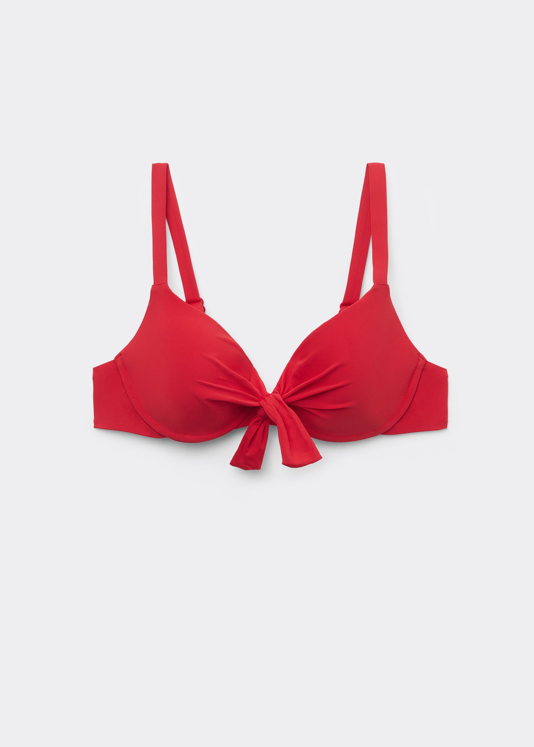Push-up bikini top with lightly padded cups and underwire to highlight the décolleté. The special bow detail at the décolleté helps to adjust the push-up effect. The extremely soft fabric makes it pleasant to wear, offering a light and comfortable feel on the skin. Adjustable straps. Back closure with two hook-and-eye closures to improve the fit of the underband.