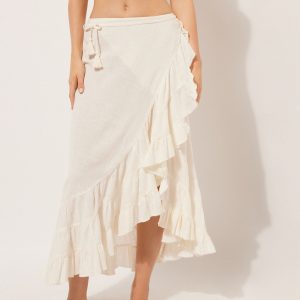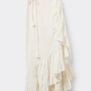Long cotton skirt with ruffle, perfect as a cover-up or for a summer outfit. Its length and lightweight fabric guarantee comfort and freshness, while the ruffle adds a feminine touch. Suitable for the beach, going for a stroll or a casual summer look.