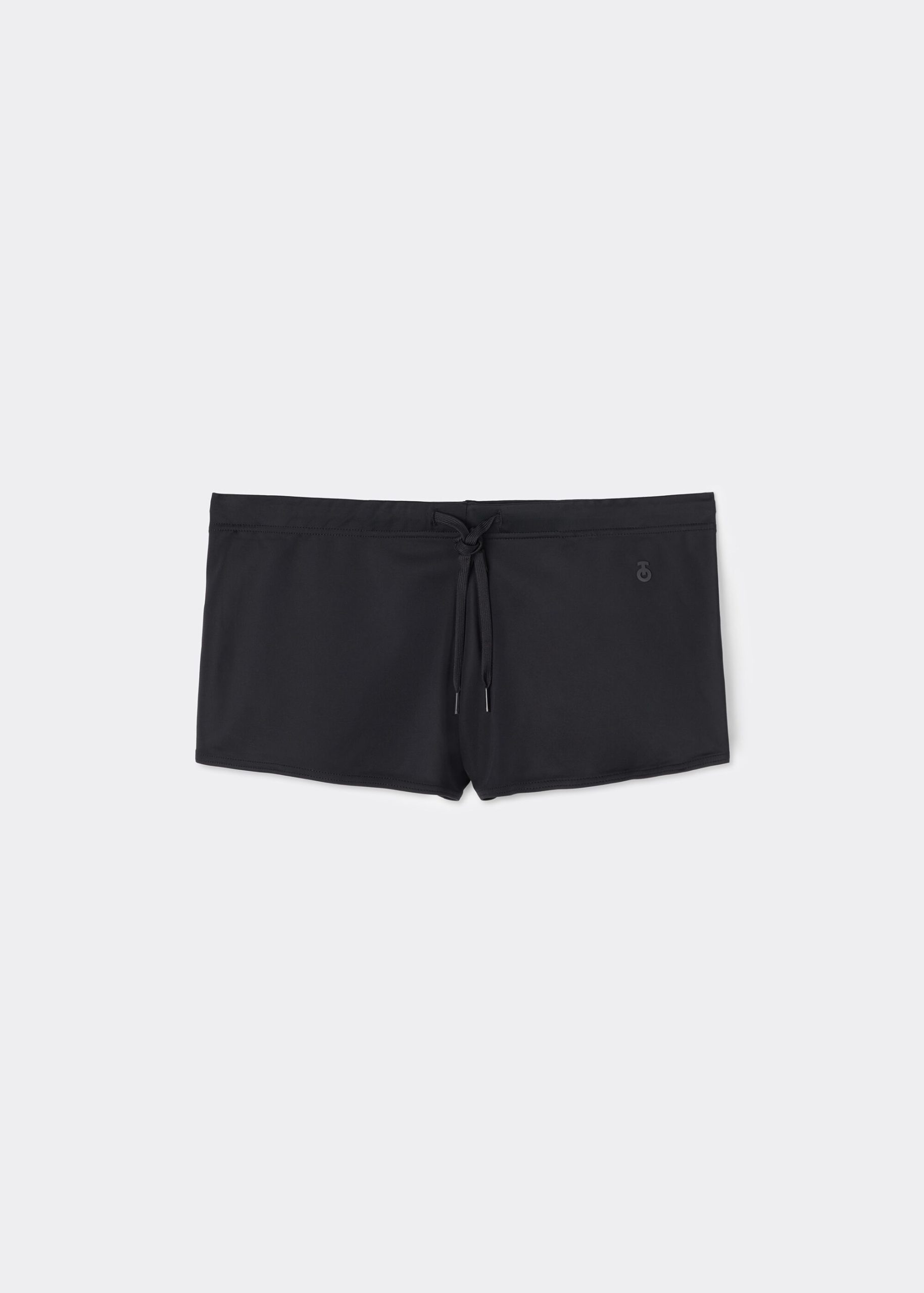 Men’s swimming shorts in microfiber with slightly high sides and regular back coverage. Covered elastic waistband and adjustable external drawstring. Interior front lining.