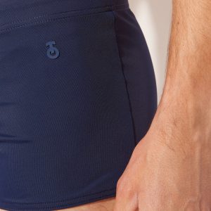 Men’s swimming shorts in microfiber with slightly high sides and regular back coverage. Covered elastic waistband and adjustable external drawstring. Interior front lining.