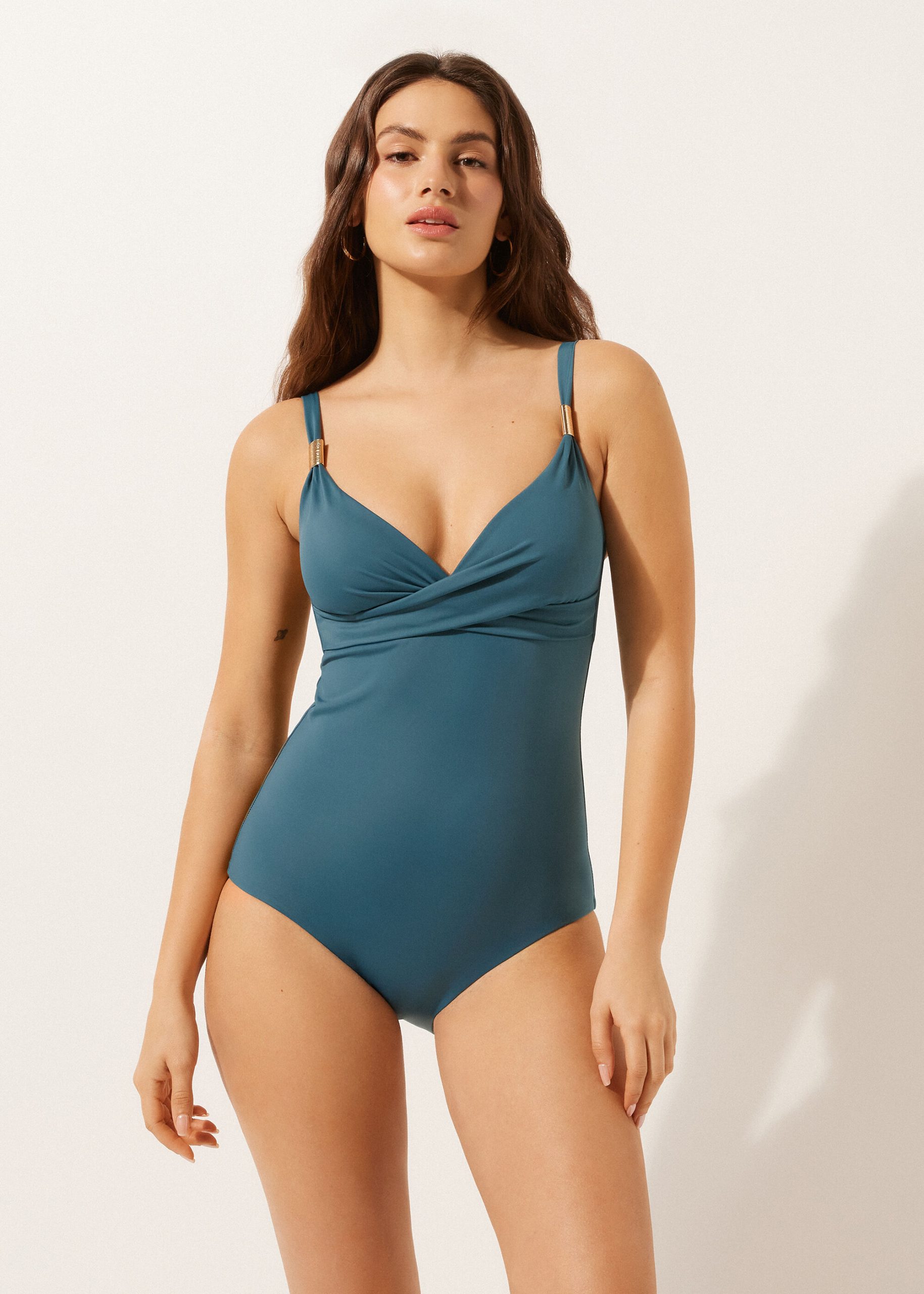 One piece swimsuit with a deep neckline, featuring wireless and unpadded cups for a natural effect. The structure of the cups and the wide fit at the sides provide good support for larger busts. The compact fabric, designed to exalt and enhance the body’s curves, ensures excellent containment and is studied to make every woman feel at ease without constraint. Adjustable shoulder straps. Back closure with two hook-and-eye closures to improve the fit of the underband. Regular bottoms coverage in back.