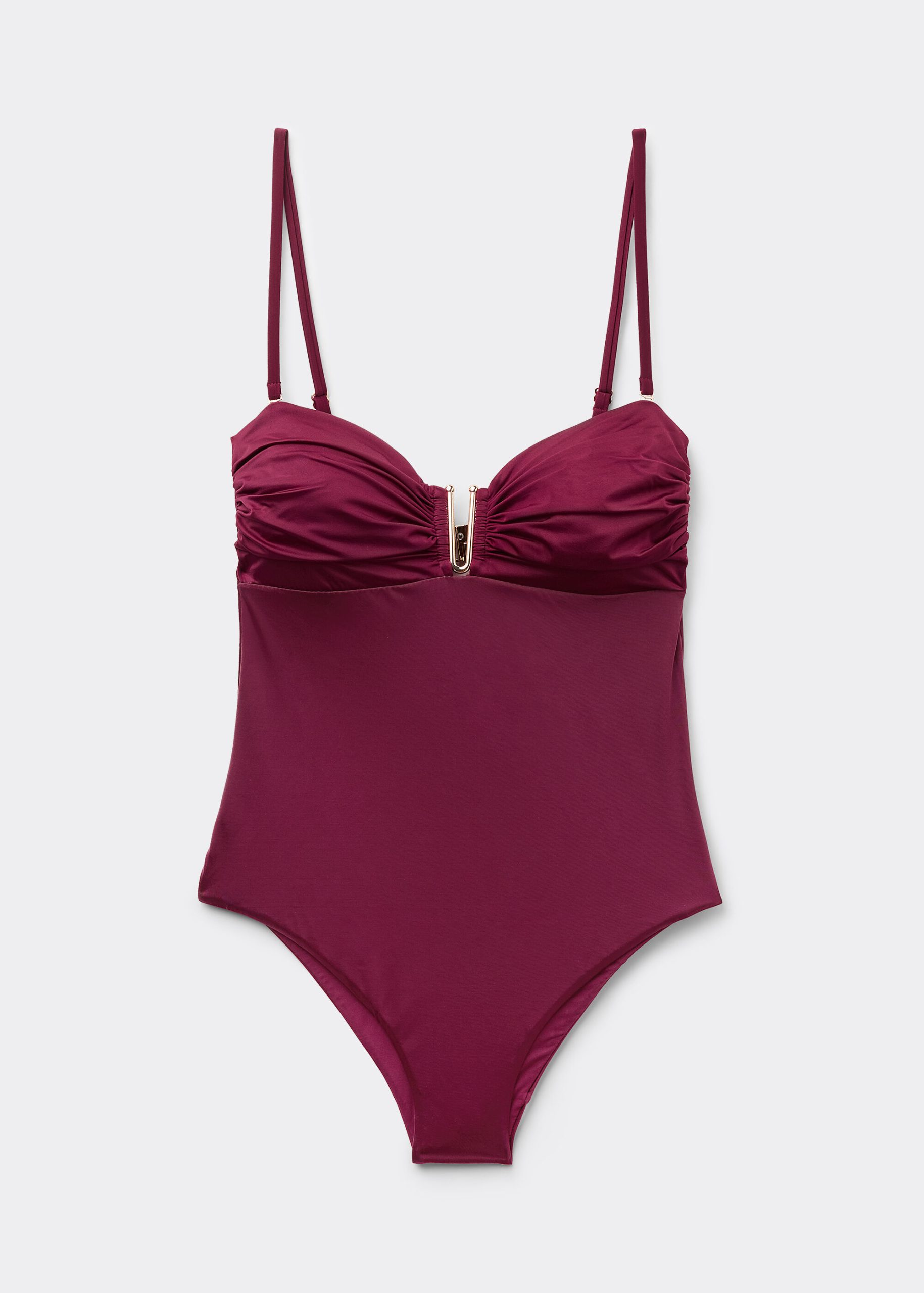 One piece wireless swimsuit with lightly padded cups embellished with an elegant gold accessory. The style features a particularly soft and comfortable bright fabric with a silky effect. Removable straps. Regular fit on the bottom. Fully lined.