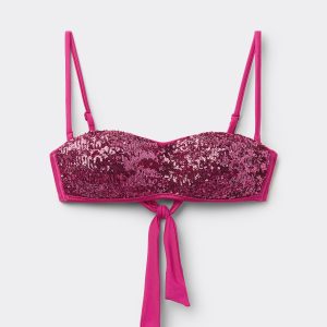 Bandeau bikini top with underwire, graduated padding cups, and side boning to guarantee good support, perfect for those with larger busts. Bright and radiant sequined fabric in bold colors, perfect for a look that grabs attention with its shimmering effect. Adjustable and removable shoulder straps. Back tie closure.