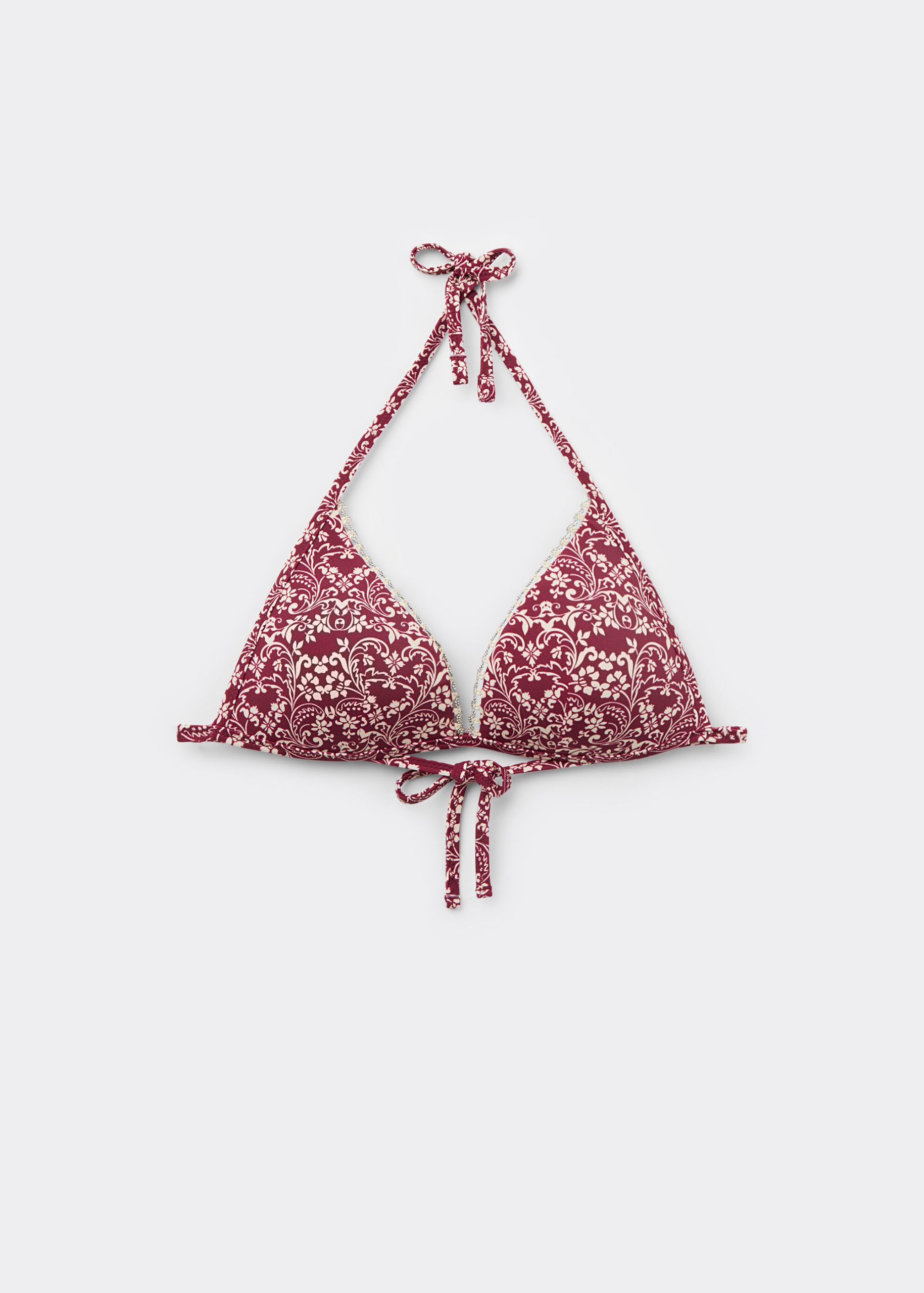 Fixed triangle bikini top with no underwire and with graduated padded cups that add volume to enhance the décolleté. An elegant floral pattern with shades of burgundy that creates a refined and natural look. The shoulder straps have eyelets on the ends so they can be hooked onto the back band or tied behind the neck. Back string tie closure.