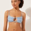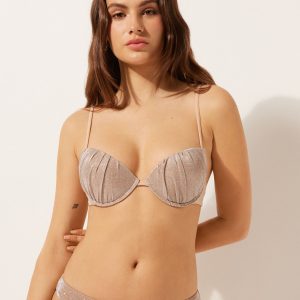 Push-up underwire bikini top with especially soft, graduated padded cups. The bright glittery fabric stands out with its sophisticated shine, not only perfect for a glamorous look on the beach but also for being paired with matching pieces. Adjustable straps and back tie closure.