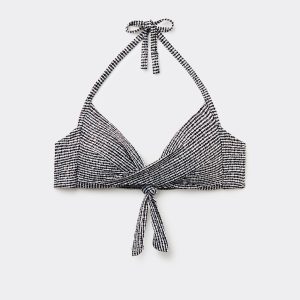 Fixed triangle bikini top with no underwire and graduated padded cups that add volume. The style features a black and white toned pattern embellished with a coated effect. The shoulder straps have eyelets on the ends so they can be hooked onto the back band or tied behind the neck. Back tie closure.