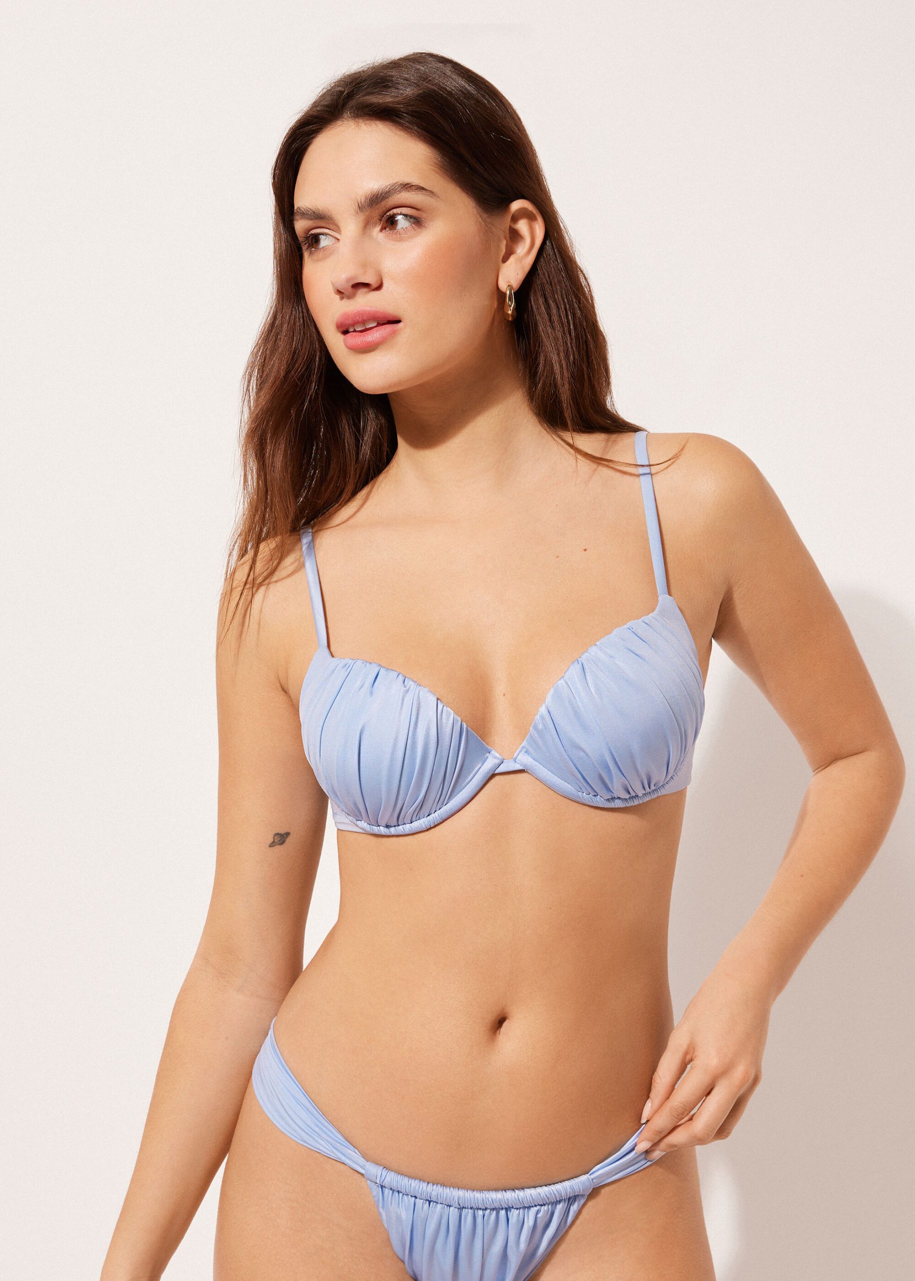 Push-up bikini top with lightly padded cups and underwire to guarantee support and provide volume. The style features a bright fabric with a silky effect. Fixed Shoulder Straps. Rear closure with double adjustment hook.