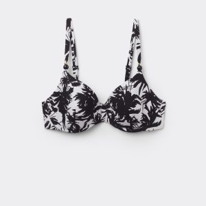 Push-up bikini top with light padding and underwire, suitable for fuller busts. The style features a black and white palm tree patterned fabric with small two-tone pearl embellishments. Adjustable, non-removable shoulder straps. Back hook closure with two adjusters.