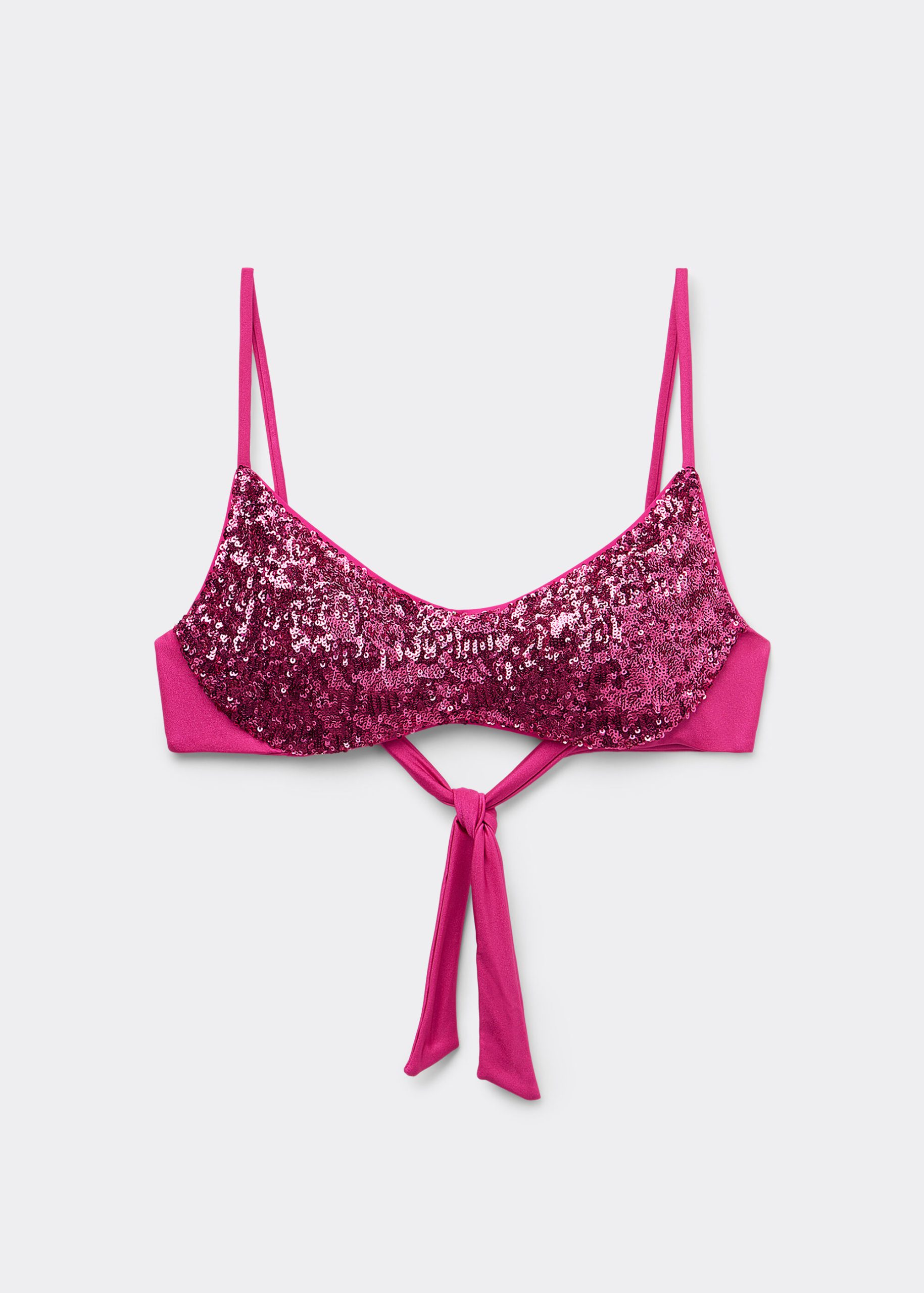 Tank-style bikini top with underwire and cups with removable padding. The shiny microfiber fabric is embellished with elegant sequins. Adjustable thin straps. Back tie closure.