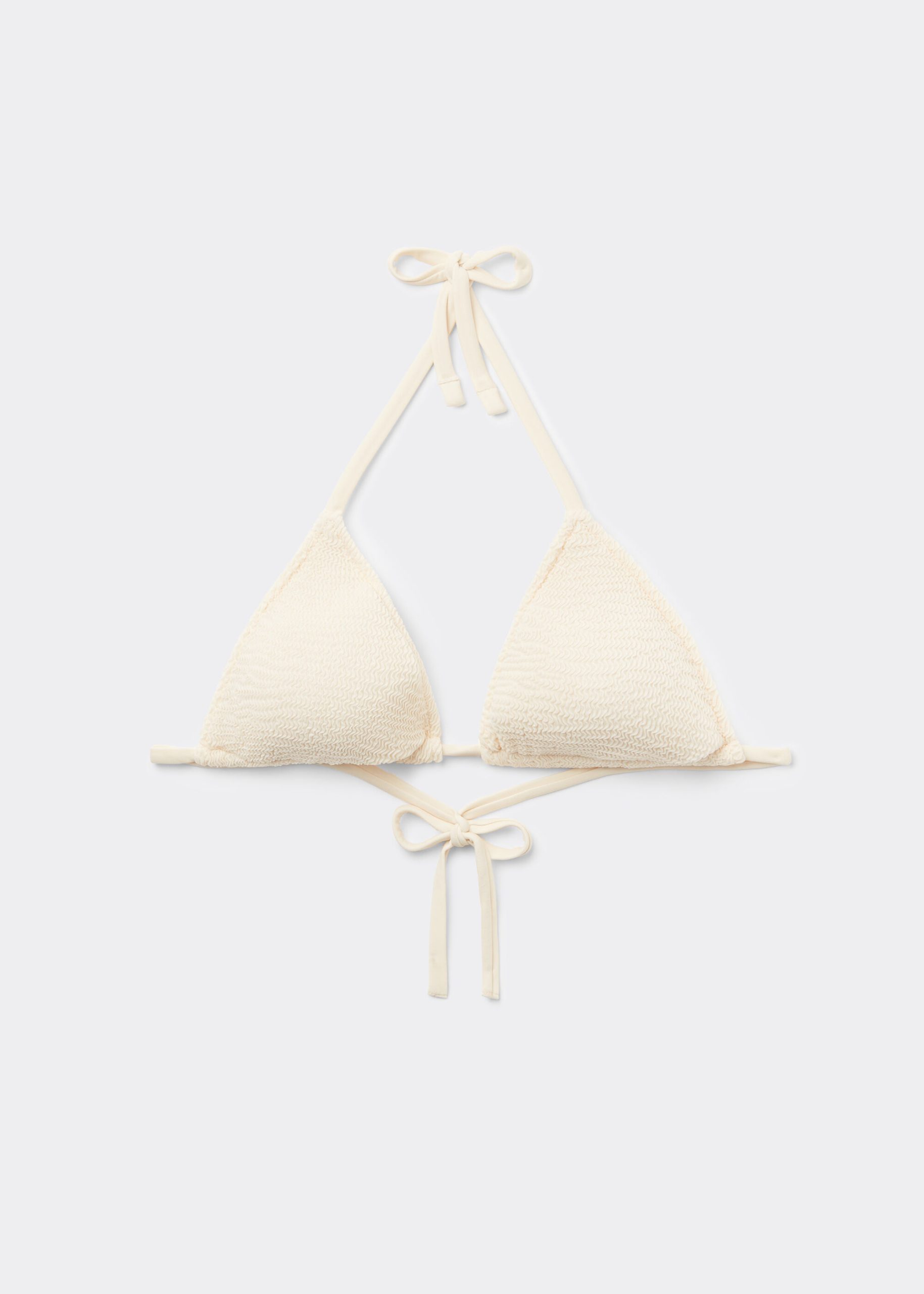 Slide triangle bikini top with removable cups and no underwire for a natural effect. The style features a crinkle fabric with a three-dimensional effect. The shoulder straps have eyelets on the ends so they can be hooked onto the back band or tied behind the neck. Back string tie closure.
