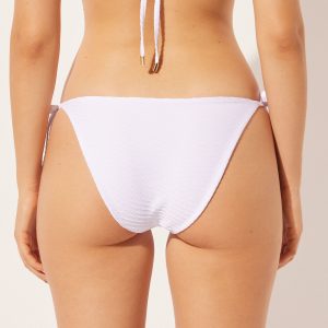 Slide triangle bikini top with removable cups and no underwire for a natural effect. The style features a crinkle fabric with a three-dimensional effect. The shoulder straps have eyelets on the ends so they can be hooked onto the back band or tied behind the neck. Back string tie closure.