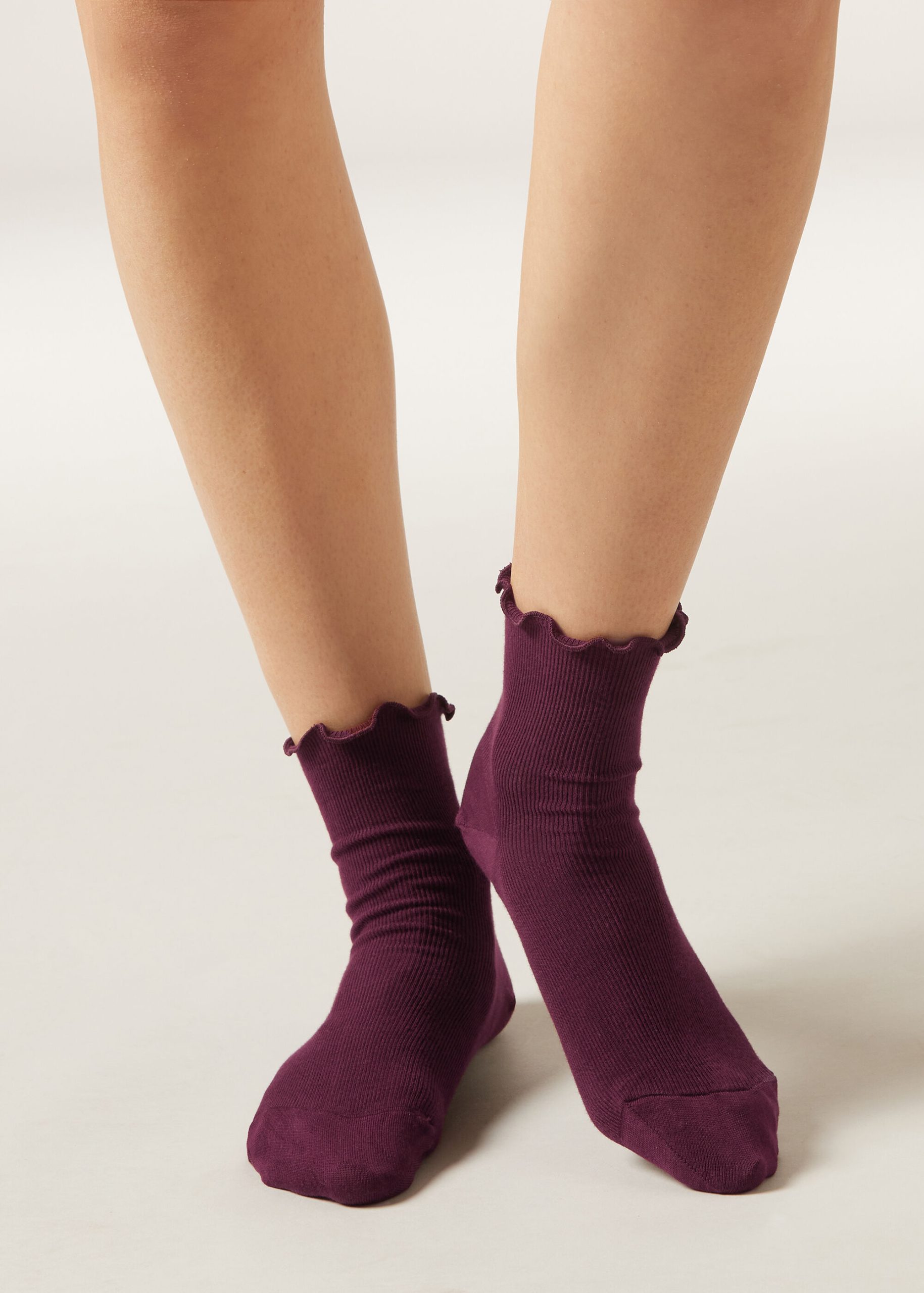 Women’s short ribbed cotton socks with romantic trim detailing.